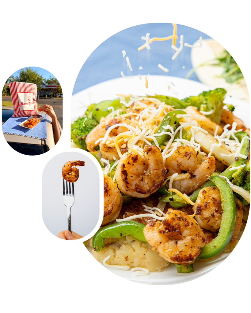 • Hearty Rice Bowls topped with seasoned steak or grilled chicken